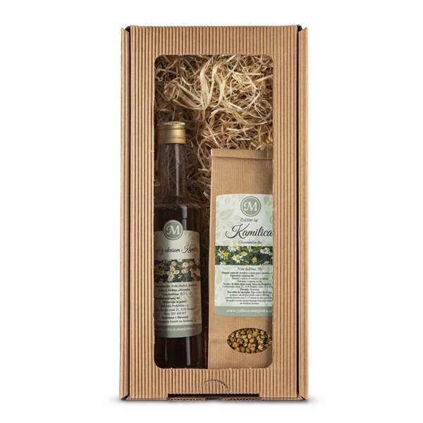 Komplet vsebuje: Sirup z okusom kamilice 0,5l Kamilični čaj 40g Dekorativna kartonska škatla v natur barvi z okencem, podlaga iz lesne slame. Opombe: Na označbi živila, ki ga boste prejeli, so navedeni VSI obvezni podatki. Ponudnik si pridržuje pravico do tipkarskih napak.